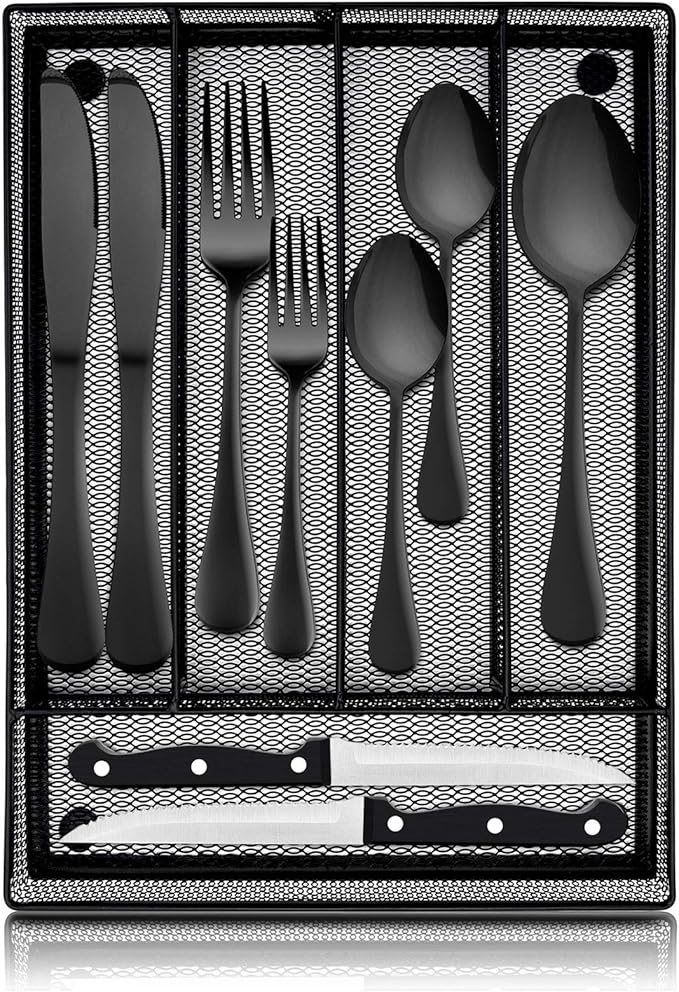 24-Piece Black Silverware Set with Steak Knives & Drawer Organizer